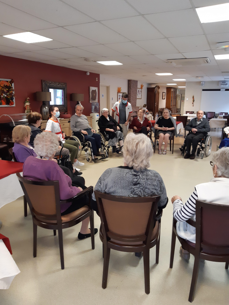 Organisée par Monsieur Dubois, éducateur spécialisé; chien, lapins, chinchillas, poules et ses poussins. Un réel moment de plaisir pour les résidents!